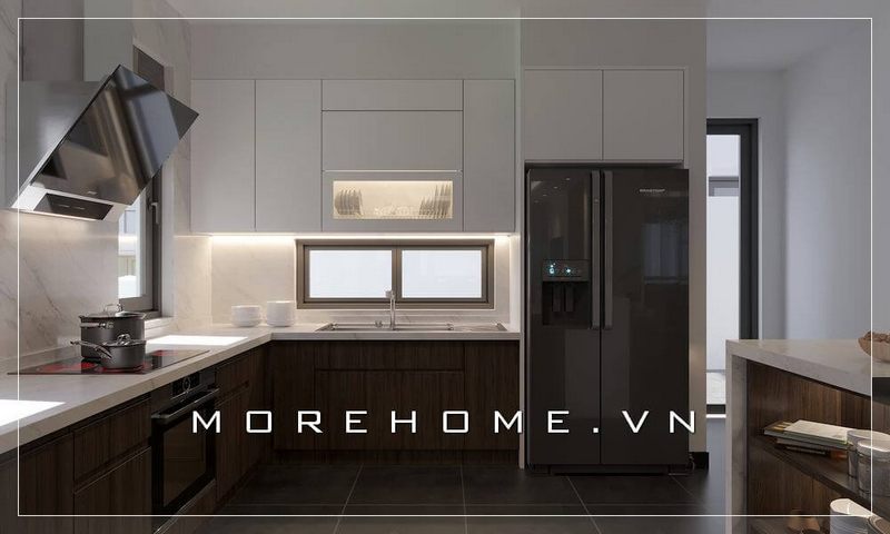 Mẫu tủ bếp gỗ công nghiệp sử dụng gam màu nâu - trắng hiện đại, thiết bị bếp đa năng giúp không gian phòng bếp tinh tế và tiện nghi hơn