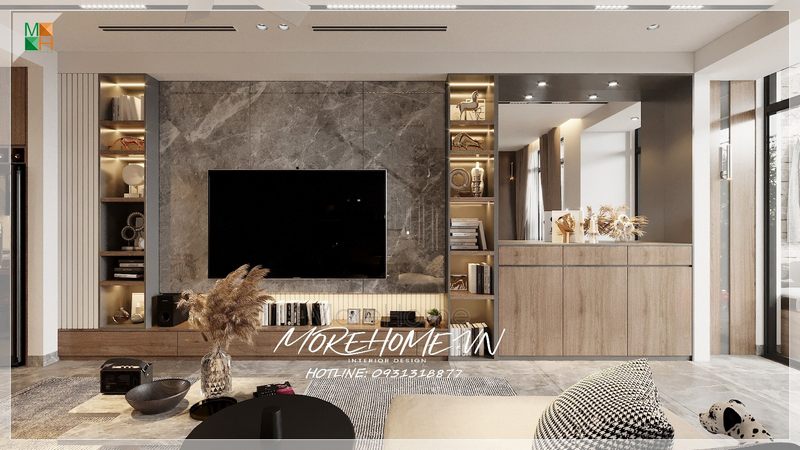 Đá ốp vách tivi màu xám vân mây tạo ấn tượng cho không gian