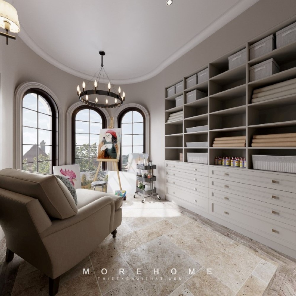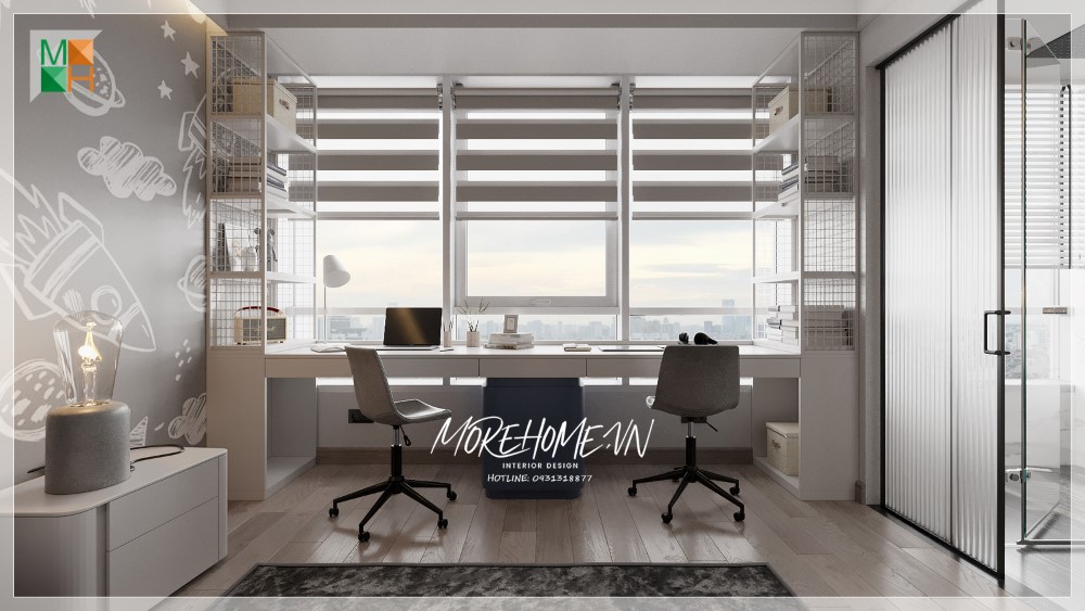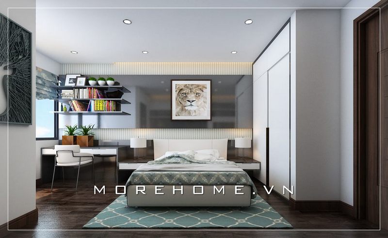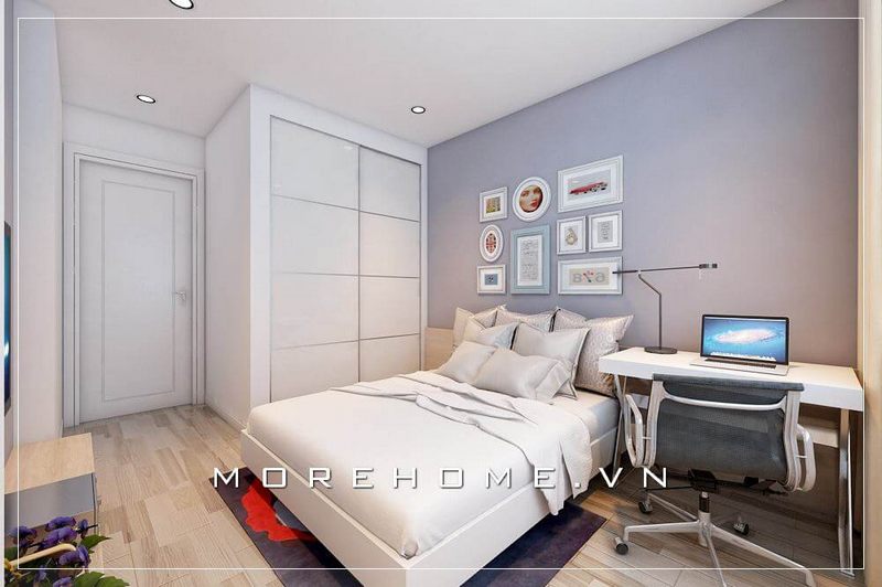 Với không gian phòng ngủ nhỏ hẹp của chung cư, nhà phố thì điểm yếu là không có cửa sổ 2 bên, KTS Morehome đã tận dụng bức tường để mở cửa sổ kính cường lực giúp căn phòng trở nên thoáng mát, dễ chịu và mở rộng không gian ra bên ngoài.