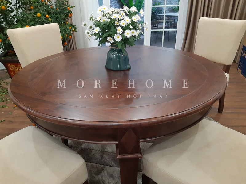 Thi công bàn ăn tròn gỗ tự nhiên hiện đại với diện tích bề mặt lớn, dễ dàng sắp xếp sử dụng trong nhiều không gian ăn, không gian bếp khác nhau