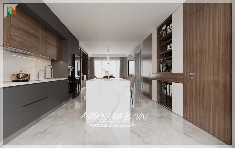 Mặt bếp được làm bằng đá ốp màu sáng với tính năng sử dụng hiệu quả, mang lại cảm giác thẩm mỹ cao và dễ dàng về việc lau chùi dọn dẹp.