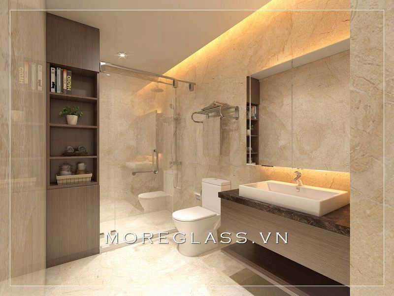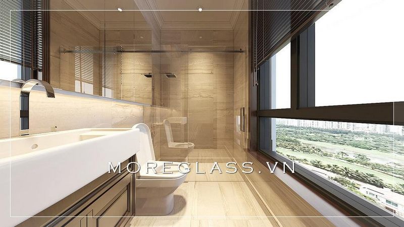Mẫu thiết kế nhà vệ sinh hiện đại của chung cư đã kết hợp với phòng tắm kính cường lực cao cấp, giúp tạo ra không gian tiện nghi và thoải mái mà không bị chật trội.