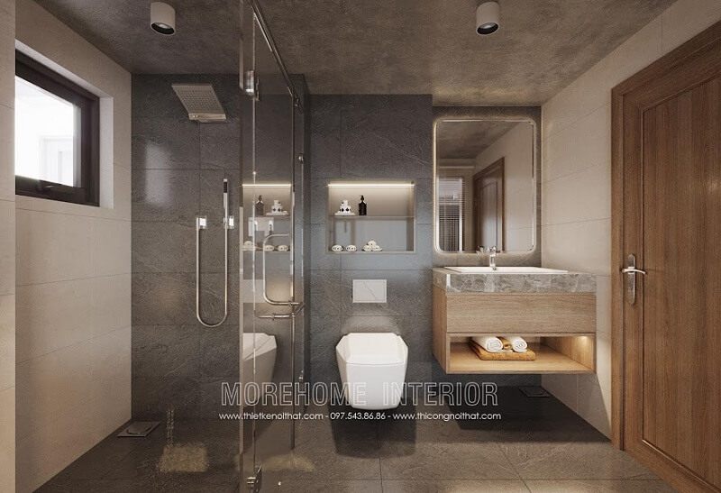 Mẫu thiết kế phòng tắm đẹp ốp đá màu xám với các thiết bị vệ sinh hiện đại kết hợp vách tắm kính cường lực tạo điểm nhấn cho căn phòng