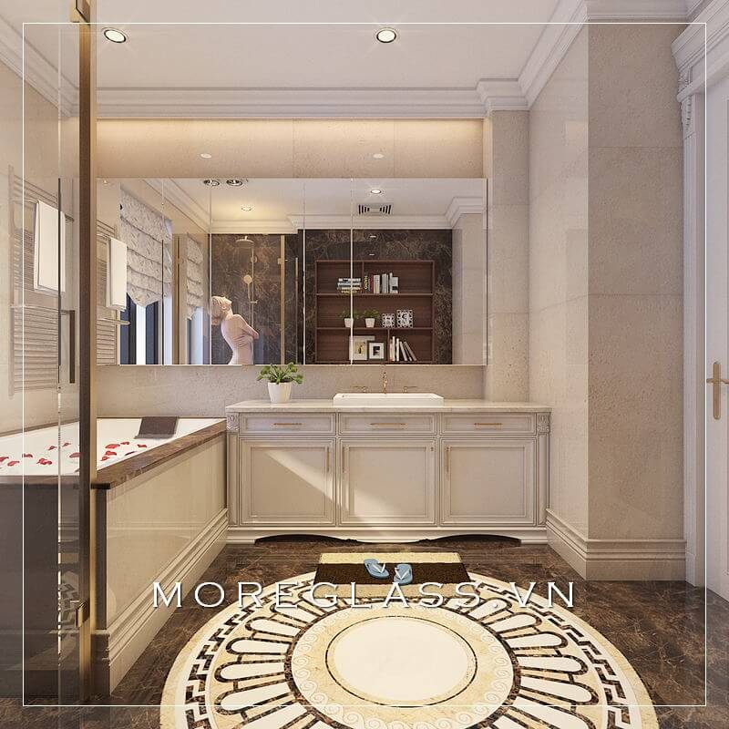 Lấy gạch lát nền hoa văn độc đáo làm nền, kết hợp với đá ốp tường phòng tắm màu vàng sáng và bức gương kính lớn, tạo nên không gian phòng tắm rộng rãi, sang trọng.