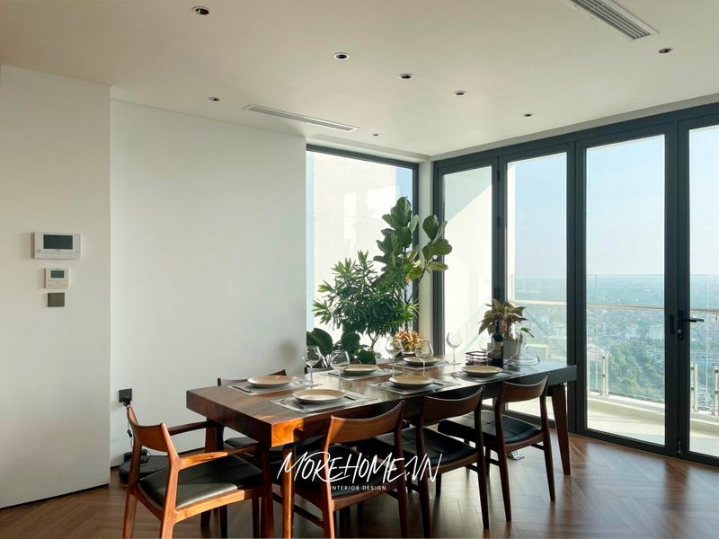 Việc tận dụng ánh sáng tự nhiên không chỉ giúp không gian trở nên thoáng đãng mà còn mang lại cảm giác gần gũi với thiên nhiên. Những cửa sổ lớn hoặc cửa kính trượt không chỉ tạo điều kiện cho ánh sáng tự nhiên tràn ngập mà còn mở ra tầm nhìn tuyệt đẹp ra bên ngoài, làm cho mỗi bữa ăn trở thành một trải nghiệm thú vị.